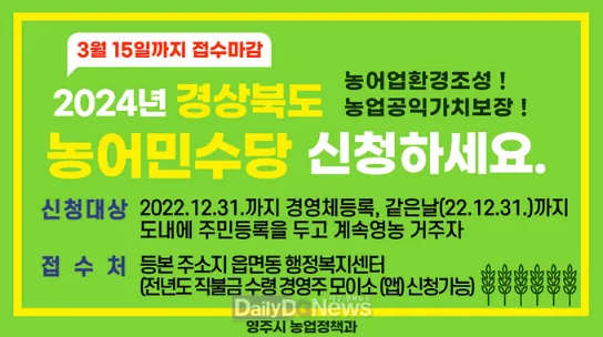 영주시장 박남서는 “농어민 수당 지원사업을 통해 농가의 어려움을 덜어드리고, 지역경제에 활력을 불어넣길 기대한다”며, “혜택을 받지 못하는 대상자가 생기지 않도록 기한 내 신청을 당부드린다”라고 말했습니다. 농어민 여러분, 지금 바로 혜택을 받기 위한 신청을 시작하세요!
