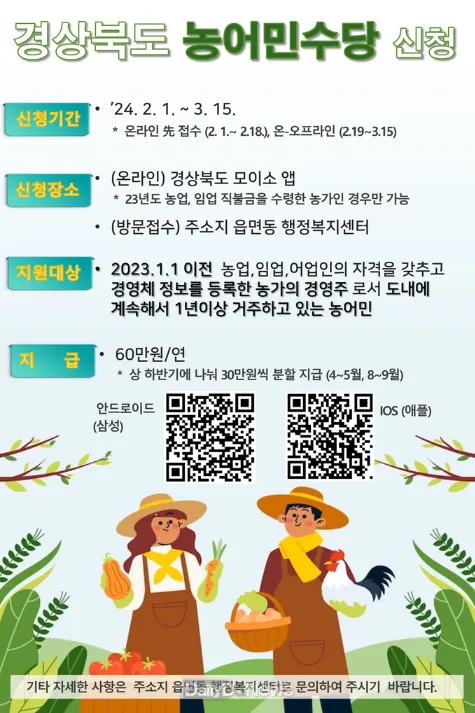 올해부터는 연접지에 거주 중인 농업인에게도 수당이 지급됩니다. 또한, '모이소 경상북도' 앱을 통한 모바일 신청이 가능해졌습니다.