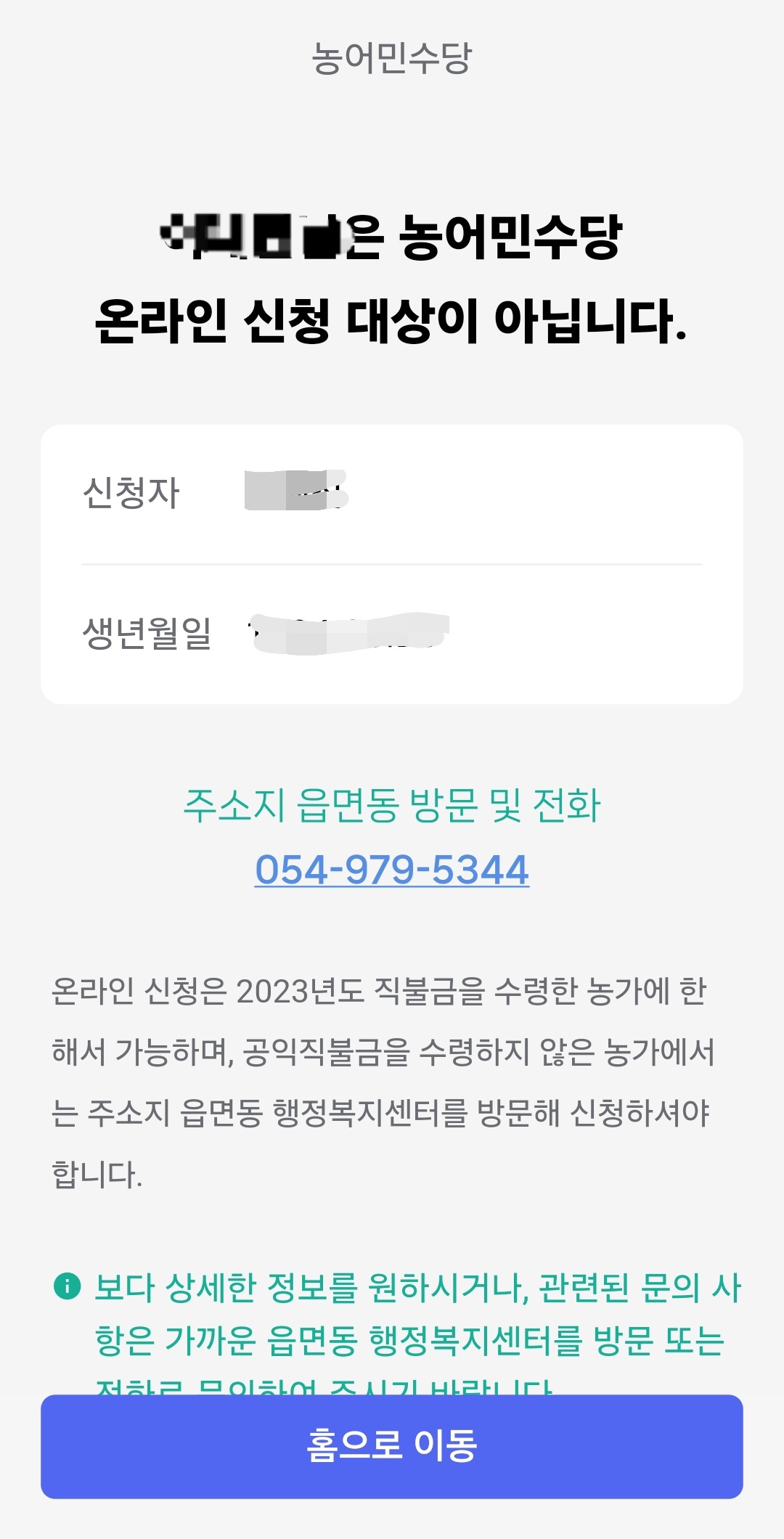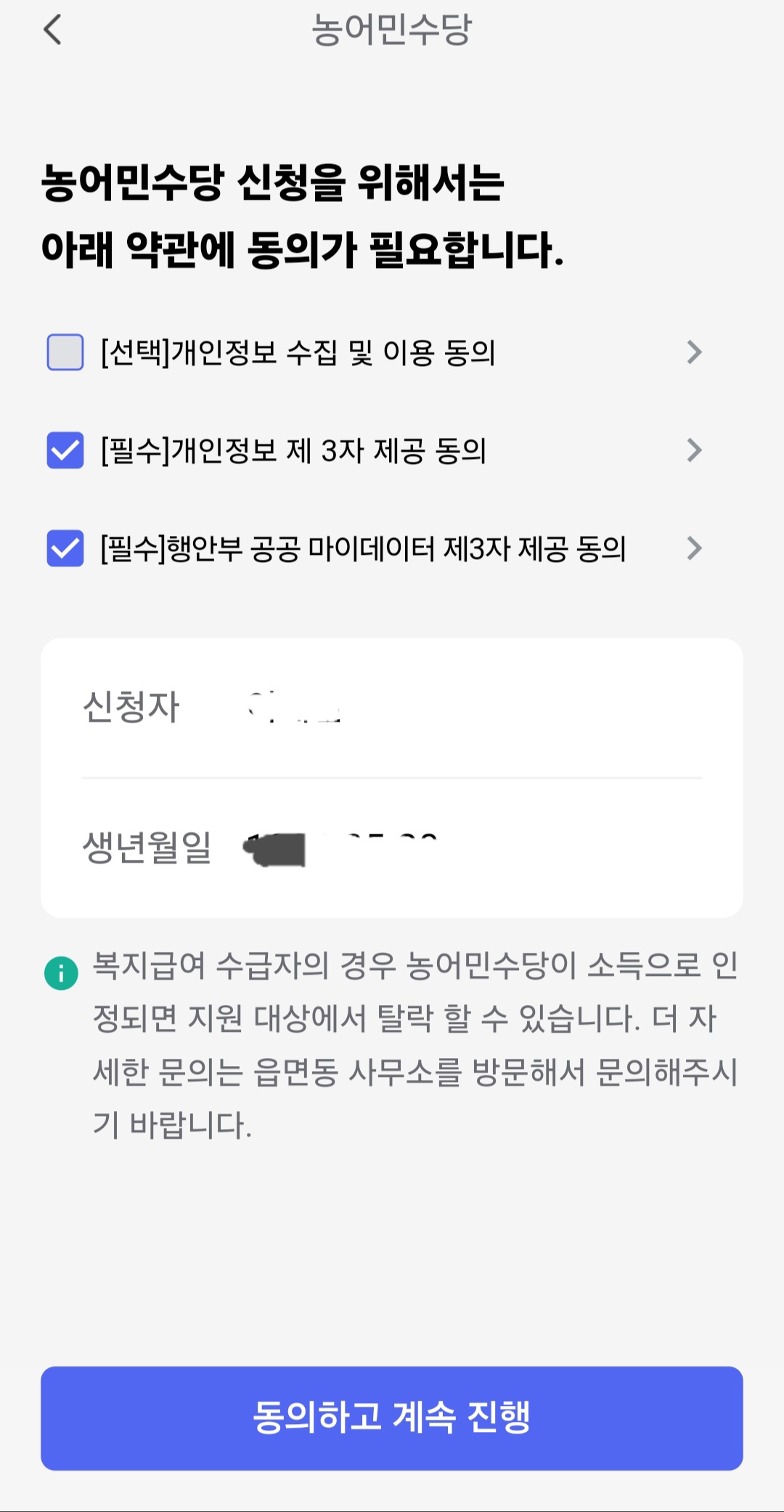 4. "농어민수당"의 필수 약관만 체크해 주시고 동의하고 계속 진행을 눌러주시면 행정안전부에서 자동으로 정보를 조회한 후 신청대상인지 아닌지 판단해 줍니다. 신청대상이 맞다면 농어민수당 신청 서약서가 보일 텐데 하단에 서약합니다를 누르면 신청접수는 완료됩니다.
