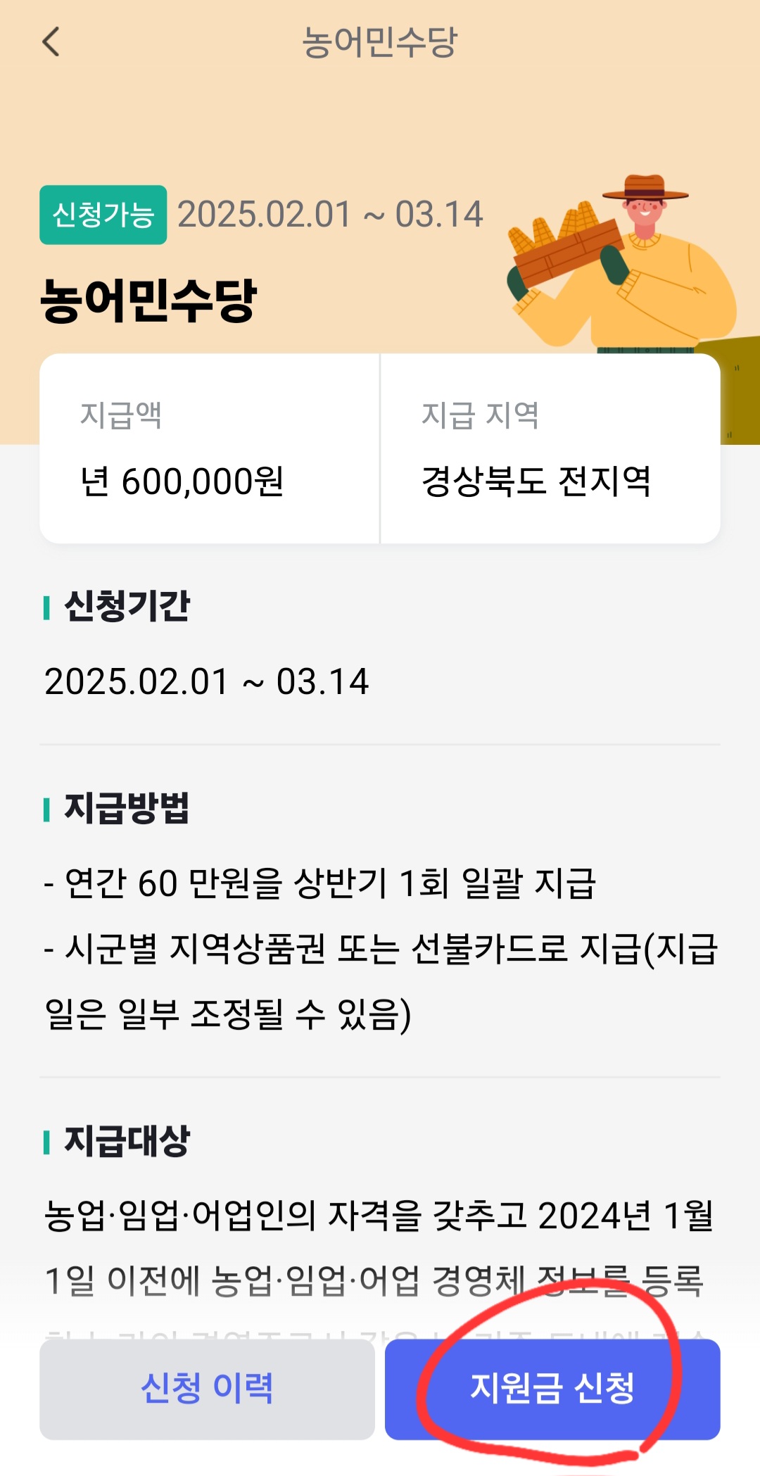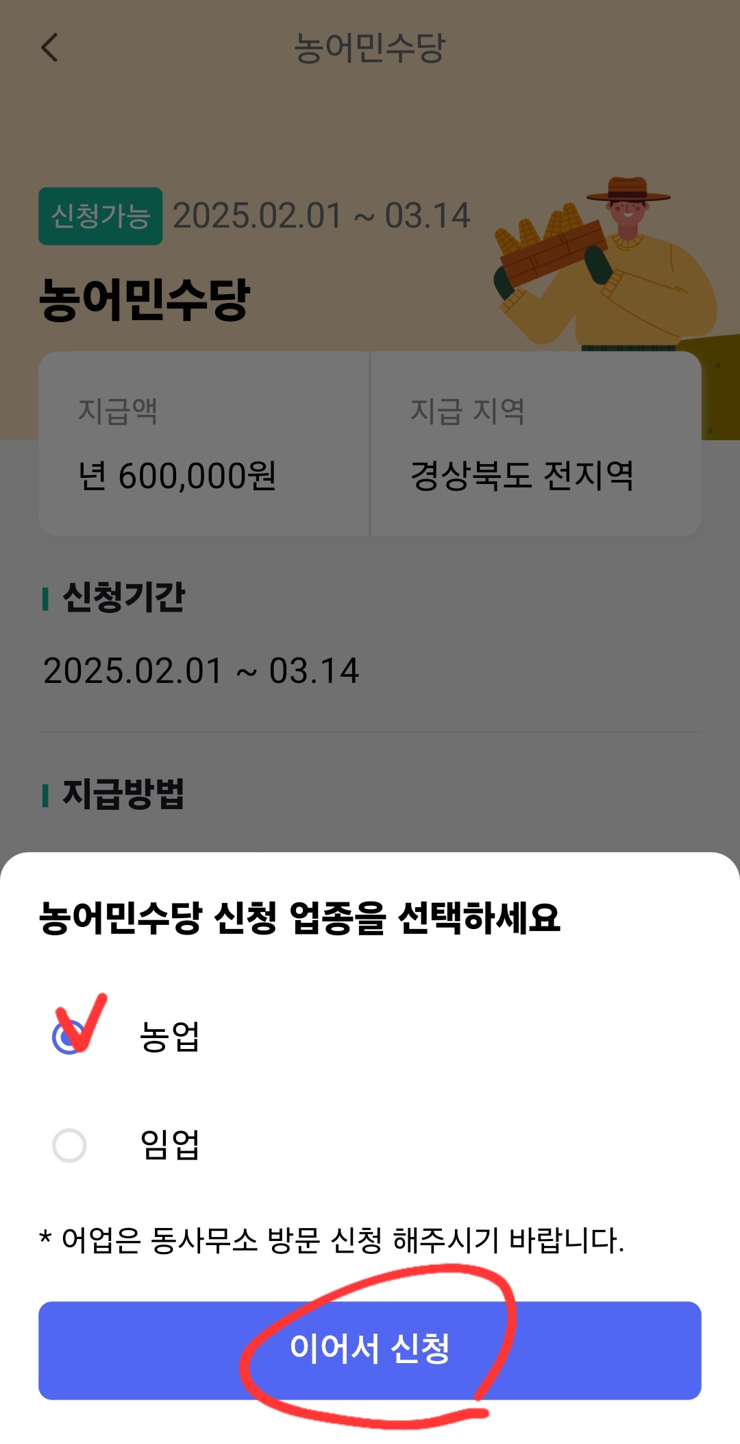 '모이소 경상북도' 앱을 이용한 농어민수당 신청은 2월 1일부터 시작됩니다. 앱을 설치하고 간단한 가입 절차를 거친 후, 신청서를 작성하면 됩니다. 특히, 전년도 직불금 수령자는 별도의 서류 제출 없이 몇 번의 터치만으로 신청을 완료할 수 있습니다.