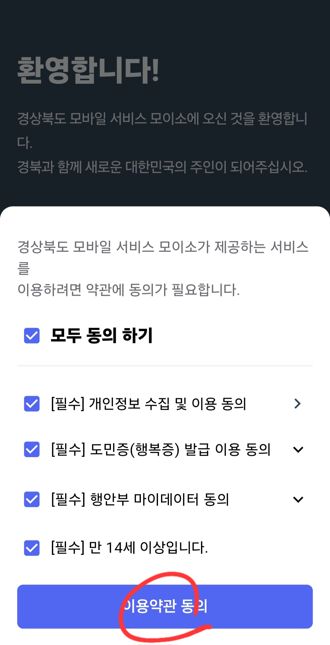1. 모바일에서 모이소 앱을 들어갑니다. "필수"는 모두 동의하기 눌러주시면 됩니다.