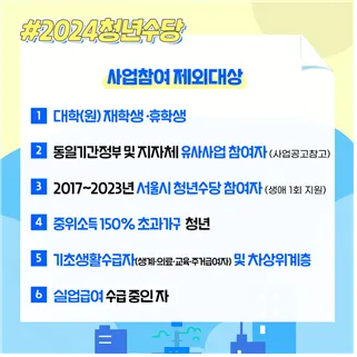 청년 여러분, 꿈을 향한 도전을 응원합니다! 서울시는 미래를 꿈꾸는 청년들의 도약을 돕기 위해 '2024년 서울 청년수당' 사업을 진행합니다. 최대 6개월 동안 월 50만 원씩 지원을 받을 수 있는 기회! 지금 바로 신청하세요!