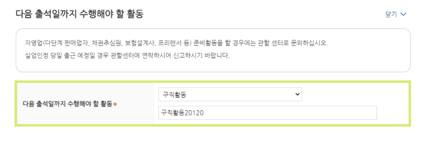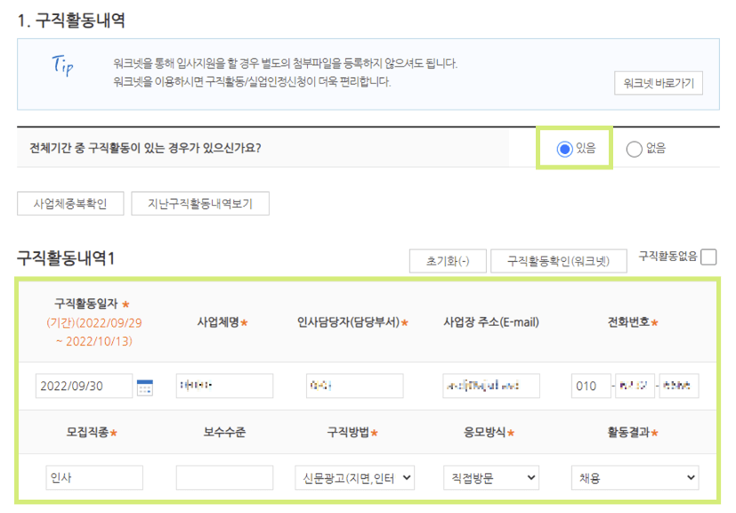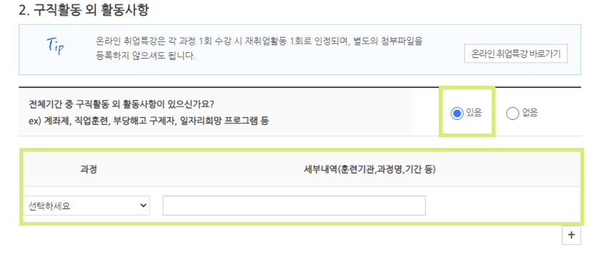 구직활동이 있는 경우 체크하고 필수 항목을 입력합니다. 여기서 자세한 내용을 정확히 기입하는 것이 중요합니다.