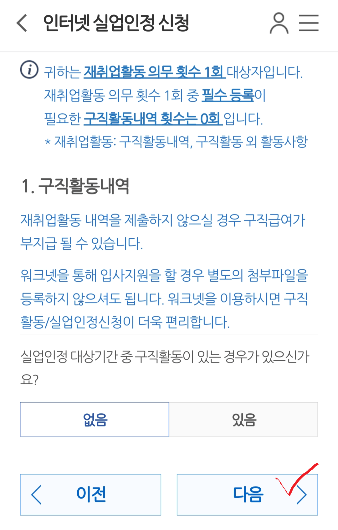 구직활동내역에 관한 내용 확인 후 다음을 눌러주세요. 구직활동에 관한 내역은 1번은 꼭 제출하여야 합니다!