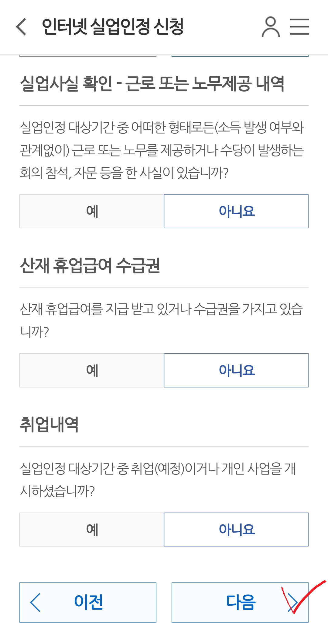 이번에는 "실업사실 확인 - 근로 또는 노무제공 내역"에 관한 부분을 모두 확인해 주시고 다음 눌러주세요.