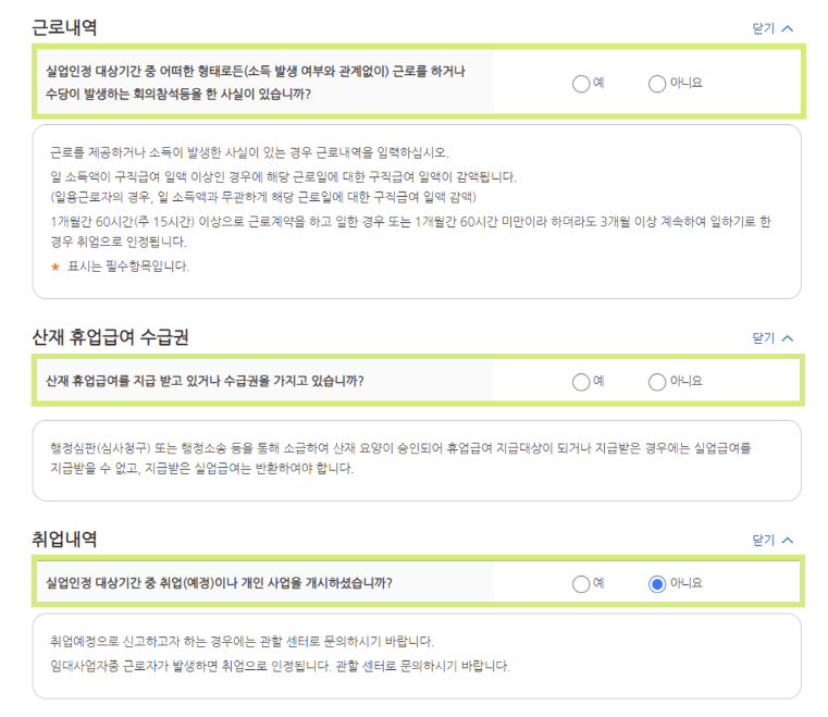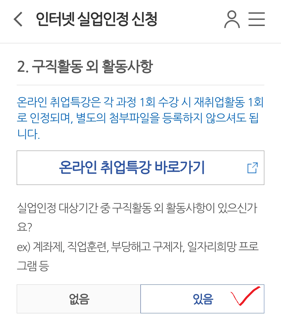 구직활동 외 활동사항이 있는 경우 체크하고 필수 항목을 정확히 기입합니다.