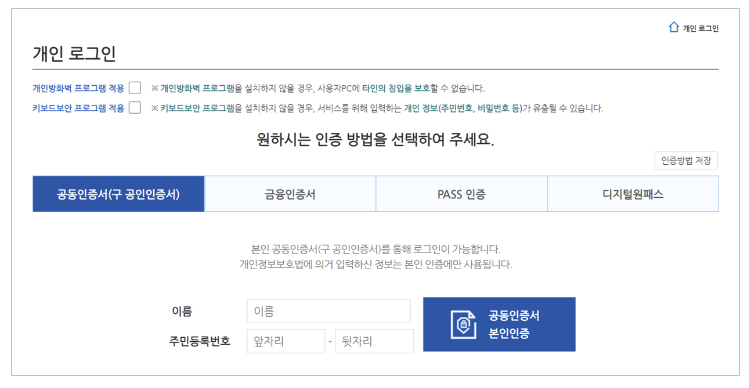 개인 로그인은 공동인증서, PASS인증, 디지털원패스 중 하나를 선택하여 진행합니다. 특히, 공동인증서로 로그인하는 경우 하단의 버튼을 클릭하세요.