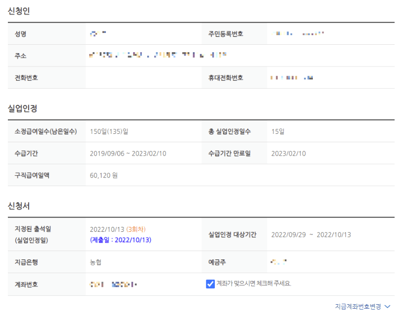 일용근로나 휴업급여 수급자, 계좌 변경 등 특정 상황에 따라 해당하는 사항을 체크하고 내용을 확인합니다.