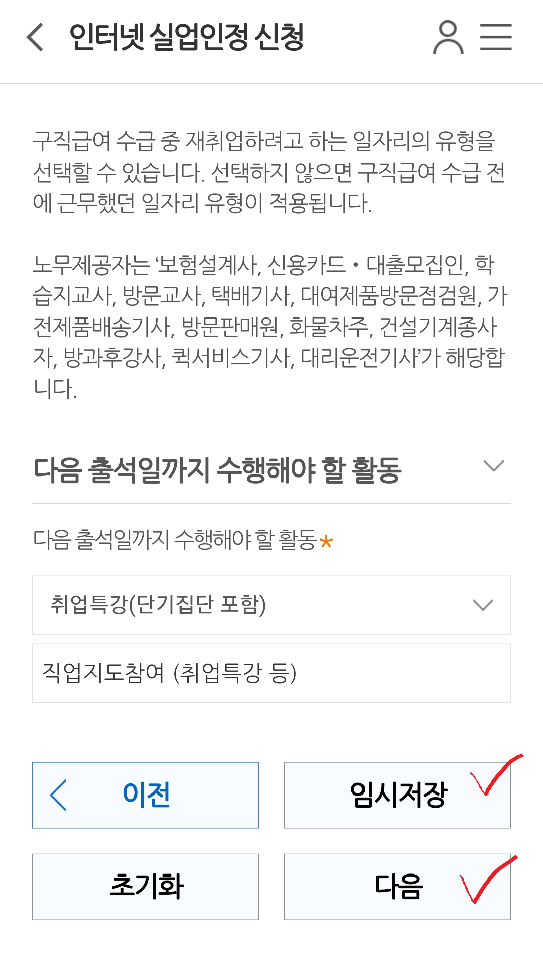 "구직활동 외 활동사항"의 내용 확인 후 다음을 눌러주세요.